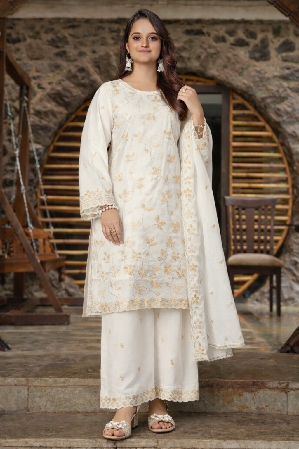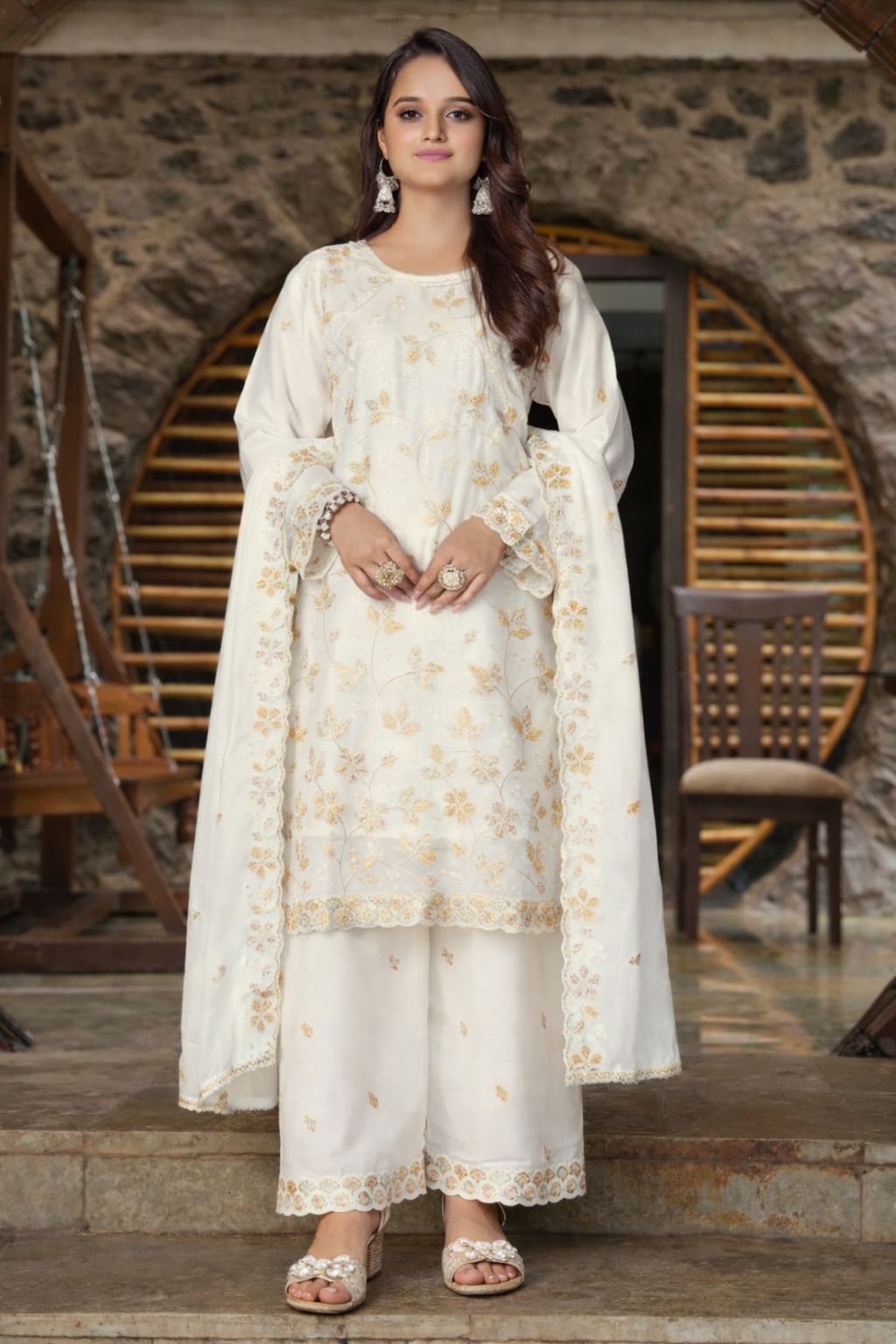 A timeless ivory shalwar kameez designed with refined embroidery and an effortlessly elegant silhouette. Crafted in silk chiffon, the kurta features delicate embroidery that adds texture and sophistication while maintaining clean, fluid lines. The look is paired with a silk chiffon palazzo bottom with work detailing, offering graceful movement and comfort. Finished with a matching silk chiffon dupatta with embroidery, this ensemble transitions seamlessly from daytime wear to evening occasions.