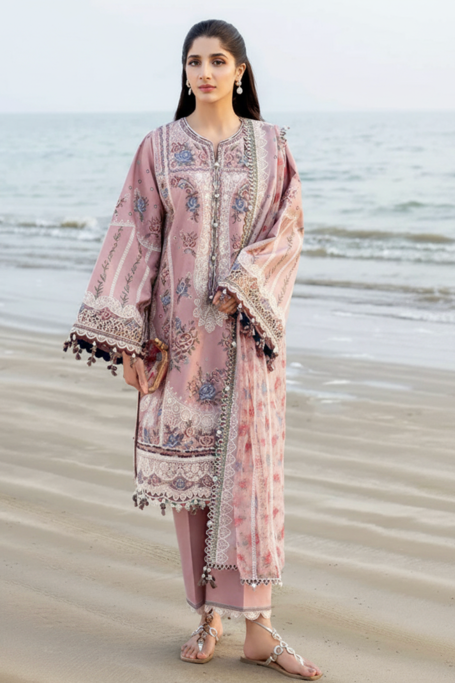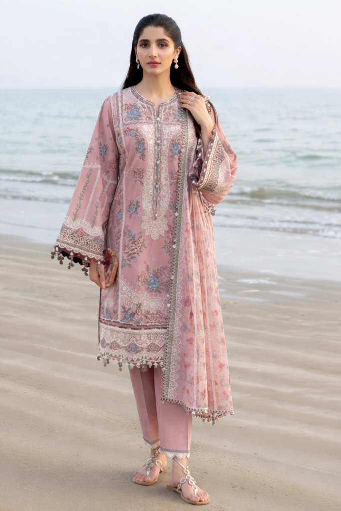 A refined dusty-rose shalwar kameez designed with delicate floral detailing and timeless elegance. The kurta features intricate printed motifs and lace accents that add softness and depth, while the straight silhouette keeps the look polished and wearable. Paired with matching trousers and a lightweight, coordinated dupatta finished with fine edging, this ensemble feels graceful yet effortless.