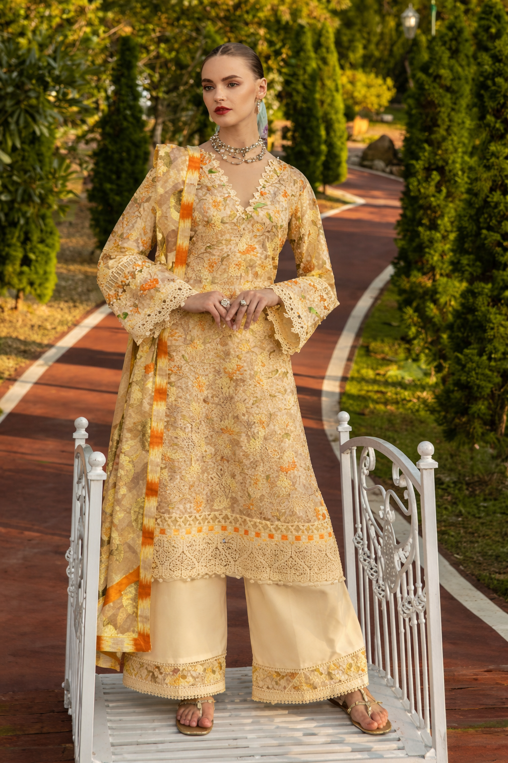 A warm yellow shalwar kameez designed to bring brightness, comfort, and everyday ease together. Crafted in pure cotton, the kurta features printed detailing with self boring work and subtle patch accents, adding texture while keeping the look light and wearable. Paired with a breathable semi-lawn bottom for comfort and a printed cotton/chiffon dupatta that completes the ensemble with soft movement.